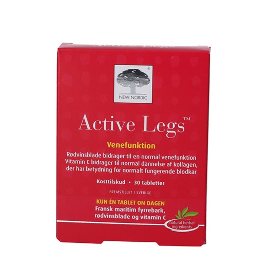 Active Legs tabletter er et kosttilskud, der indeholder en kombination af ekstrakter fra fyrrebark og vinblade, ekstrakt af sort peber samt vitamin C.