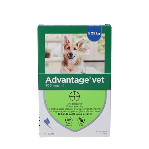Advantage vet. er en opløsning, der anvendes til forebyggelse og bekæmpelse af loppeangreb hos hunde og katte.