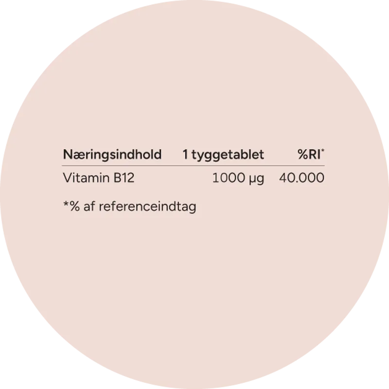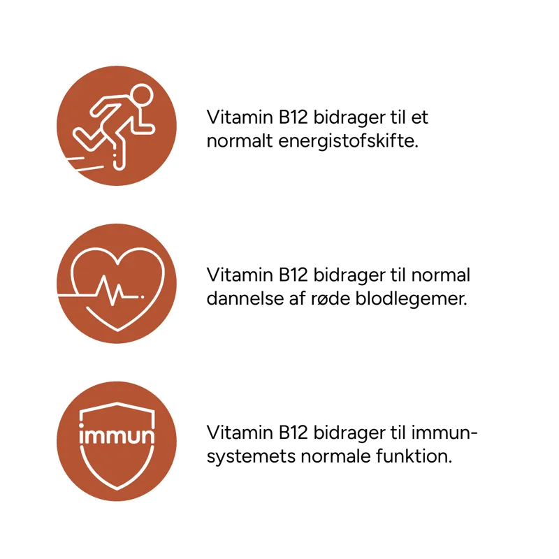 B12-vitamin bidrager til at reducere træthed og udmattelse samt til immunsystemets normale funktion.