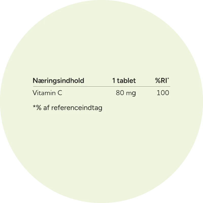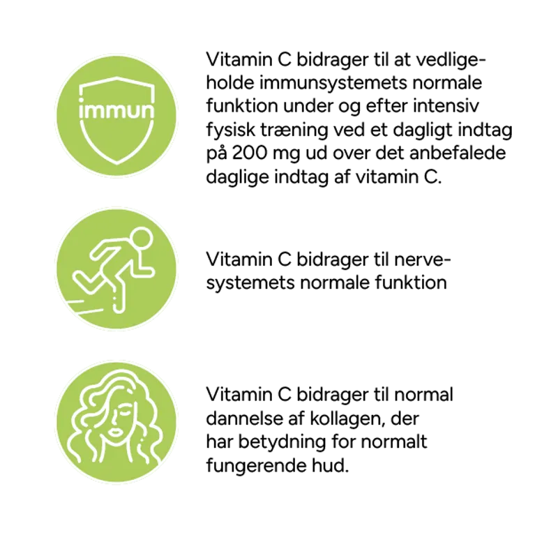 C-vitamin bidrager til immunsystemets normale funktion samt bidrager til at mindske træthed og udmattelse.