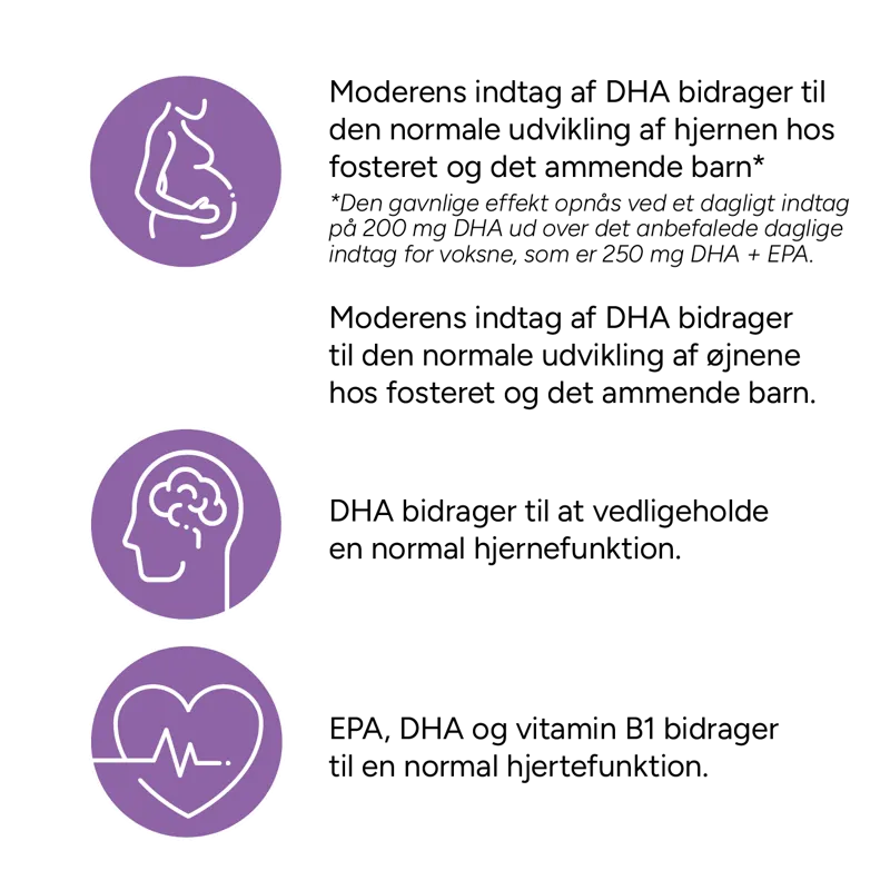 Moderens indtag af DHA bidrager til normal udvikling af hjernen og øjnene hos fostret og hos spædbørn der ammes.