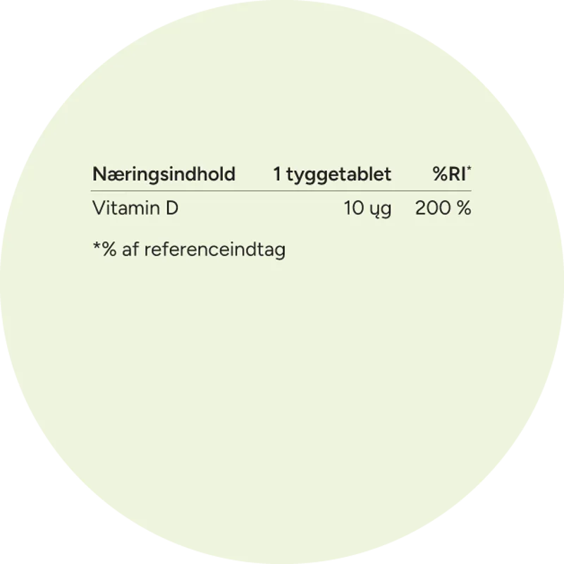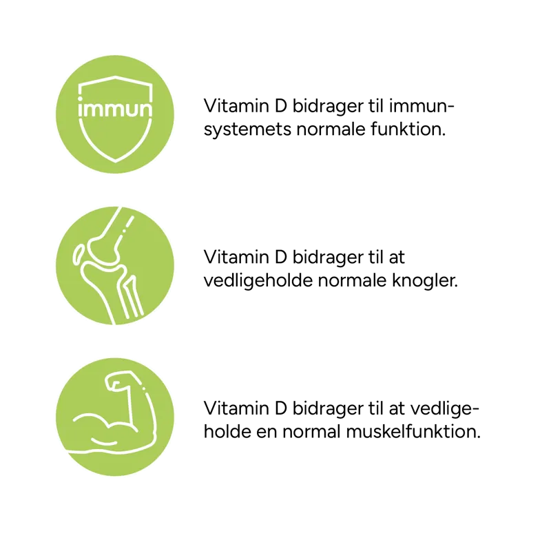 D3-vitamin støtter immunforsvaret samt bidrager til at vedligeholde normale knogler, tænder og muskelfunktion.