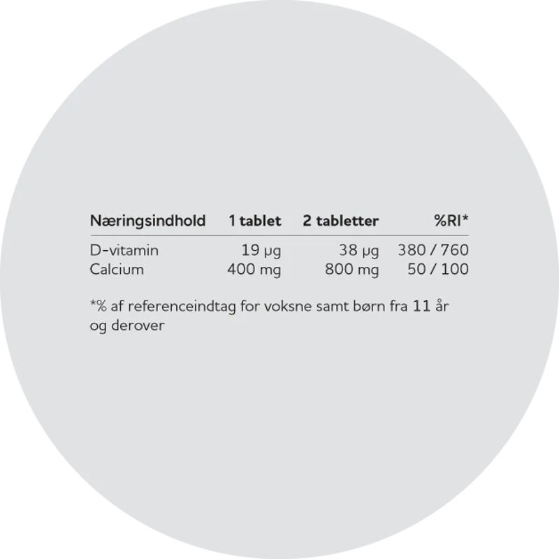 Kalk er nødvendigt for vedligeholdelse af normale knogler og tænder. D-vitamin bidrager til normal optagelse/udnyttelse af kalk.