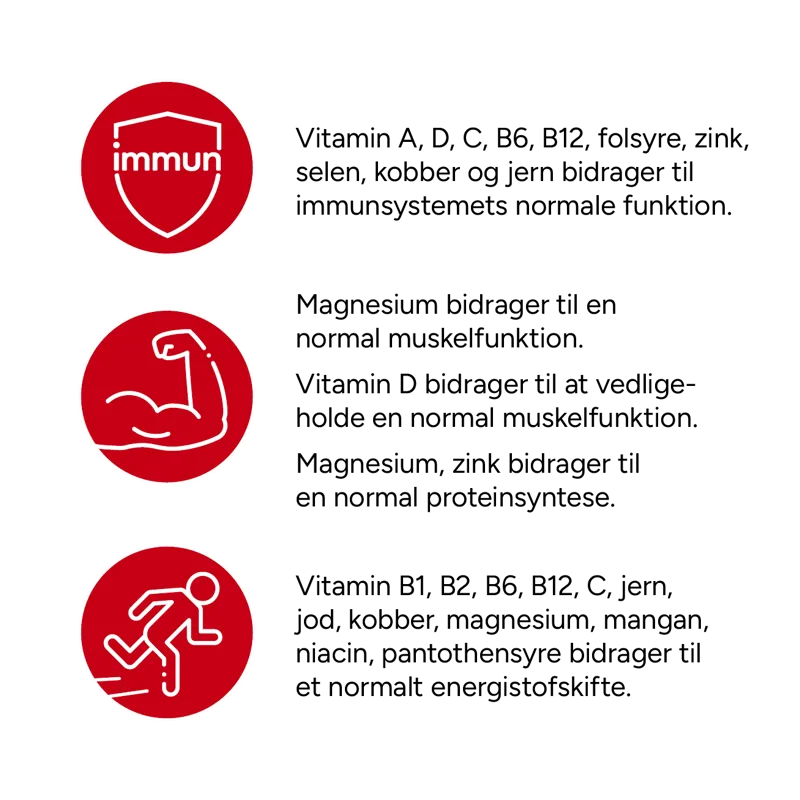 Apovit Multi indeholder 11 vitaminer og 9 mineraler.