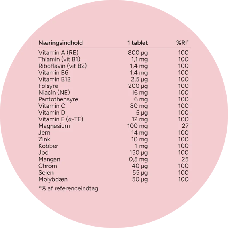 Næringsindhold pr. daglig dosis (1 tablet) i mængde og %RI*: