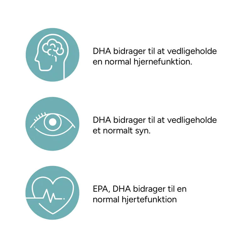 ** Den gavnlige effekt opnås ved et dagligt indtag på 250 mg DHA, svarende til 2 kapsler.