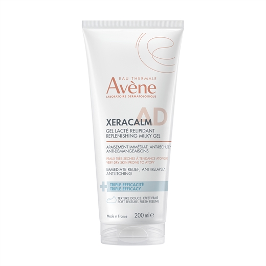 Avène XeraCalm AD Milky Gel er en let og fugtgivende bodylotion til meget tør hud med tendens til atopi. Bodylotionen beroliger huden omgående, mindsker kløe og hjælper med at dæmpe intensiteten af fremtidige udbrud. Samtidig forlænger den hvileperioderne mellem udbrud af kløe forbundet med tør hud, så huden føles mere komfortabel over tid.