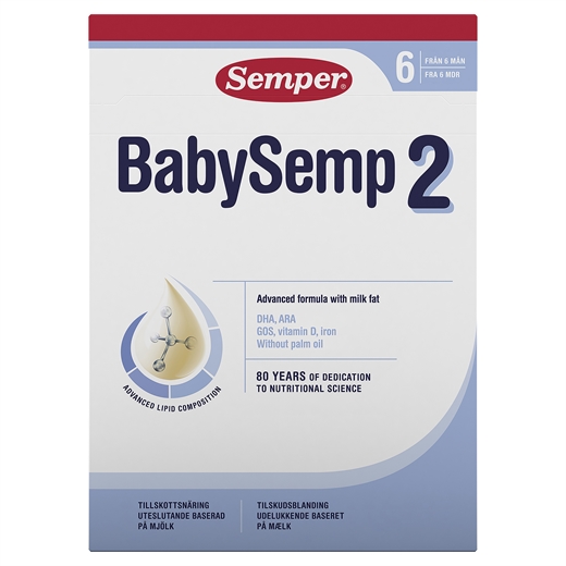 BabySemp 2 baseret udelukkende på mælk. BabySemp 2 indeholder mælkefedt og er fri for palmeolie. Kulhydratet i BabySemp 2 kommer udelukkende fra laktose (mælkesukker).