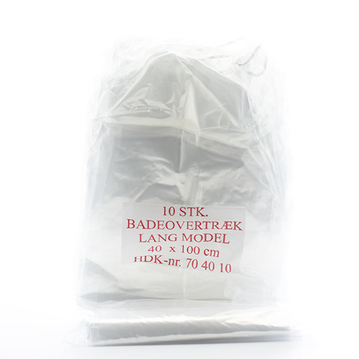 Badeovertrækket er en rektangulær plastikpose med en elastik foroven.