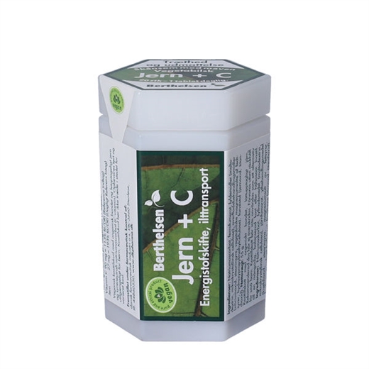 Berthelsens Jern+ C er et vegansk kosttilskud med organisk bundet og letoptagelig jern og syreneutralt C-vitamin.