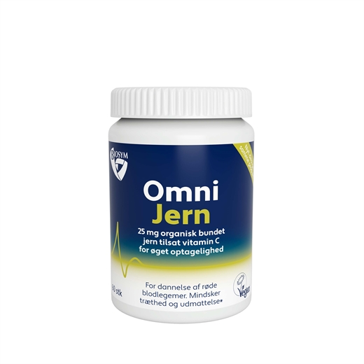 Biosym OmniJern Kapsler er et vegansk kosttilskud med 25 mg aminokelateret jern (jern bisglycinat chelat) og 40 mg vitamin C.