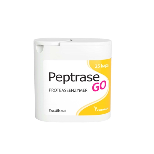 Kapslerne kommer i praktisk emballage til at have med på farten. Enzymerne i Biosym Peptrase GO spalter kæden af aminosyrer i halve samt spalter enderne af kæden. På denne måde nedbrydes proteinet effektivt.