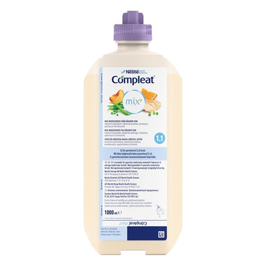 Compleat Mix har et fuldgyldigt indhold af næringsstoffer til voksne ved indtagelse af 1500 ml pr. dag. Den er klinisk laktose- og glutenfri.