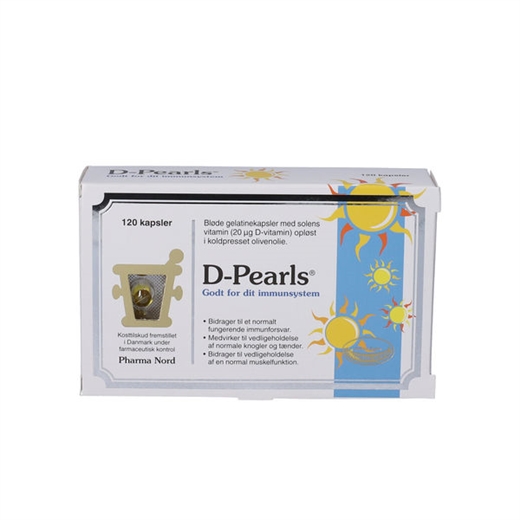 D-Pearls er bløde gelatinekapsler hvor D-vitaminet er opløst i koldpresset olivenolie.