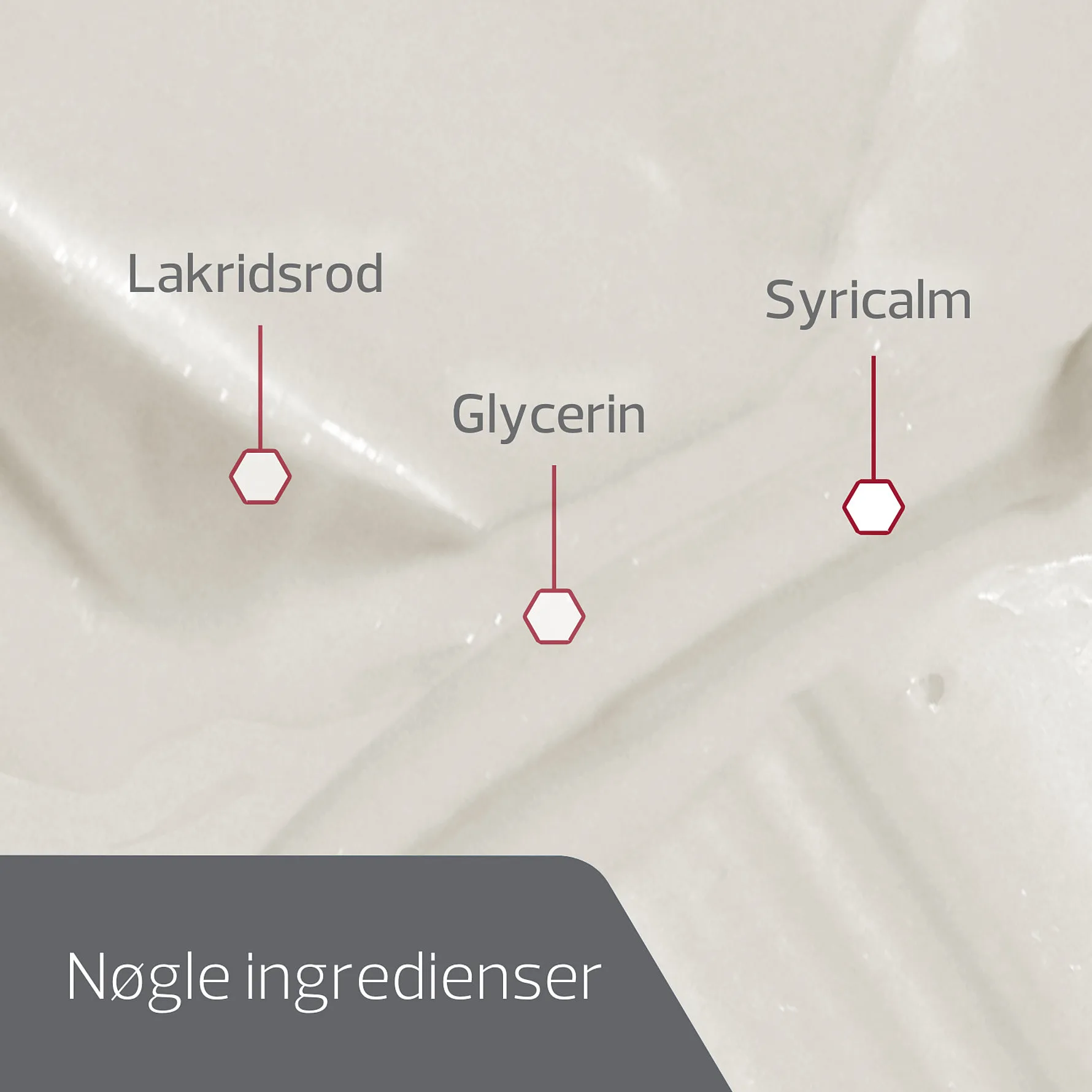 Cremen indeholder blandt andet Syricalm og Dipotassium Glycyrrhizate (lakridsrod), som virker kløestillende og beroligen på irriteret hud.