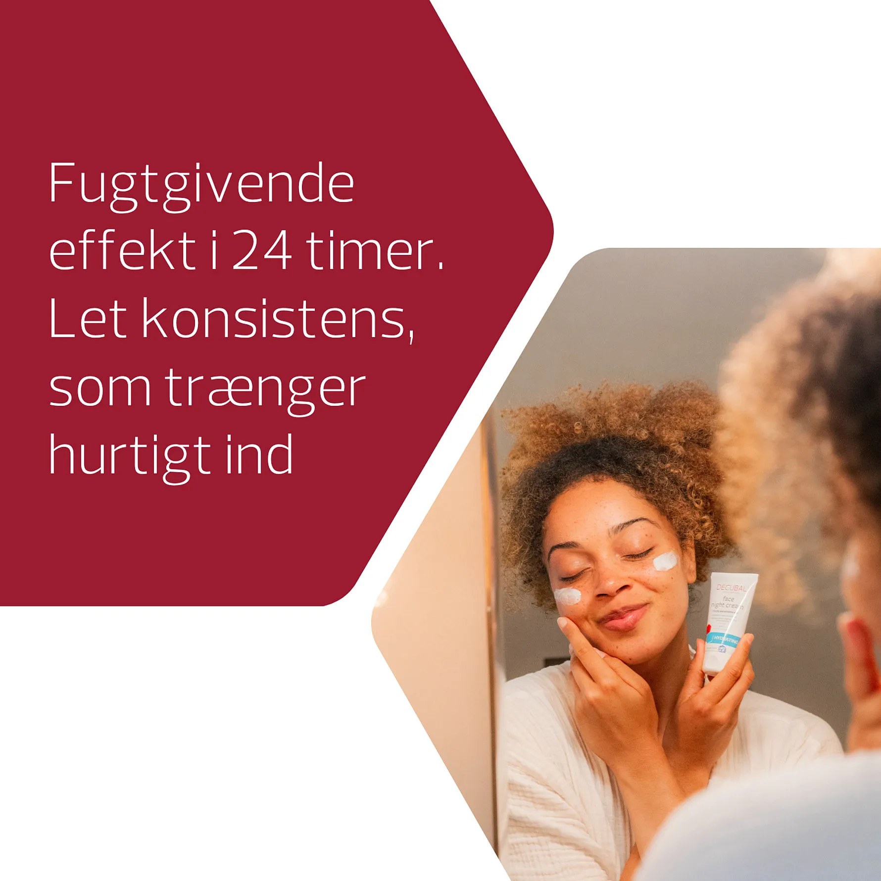 Decubal hydration night cream er formuleret med en høj koncentration af, antioxidanter, 5 nærende naturlige olier og fugtgivende ingredienser som Betaine og NEOSOLUE-AQUA S, for en blødere, styrket og mere ensartet hud. Et omhyggeligt udvalg af effektive, men skånsomme ingredienser, der forhindre fugttab, fugter huden i dybden og forbedrer hudens naturlige barriere. Huden næres, fugtes og beskyttes, mens du sover, og du vågner med en fugtet og mere elastisk hud.
