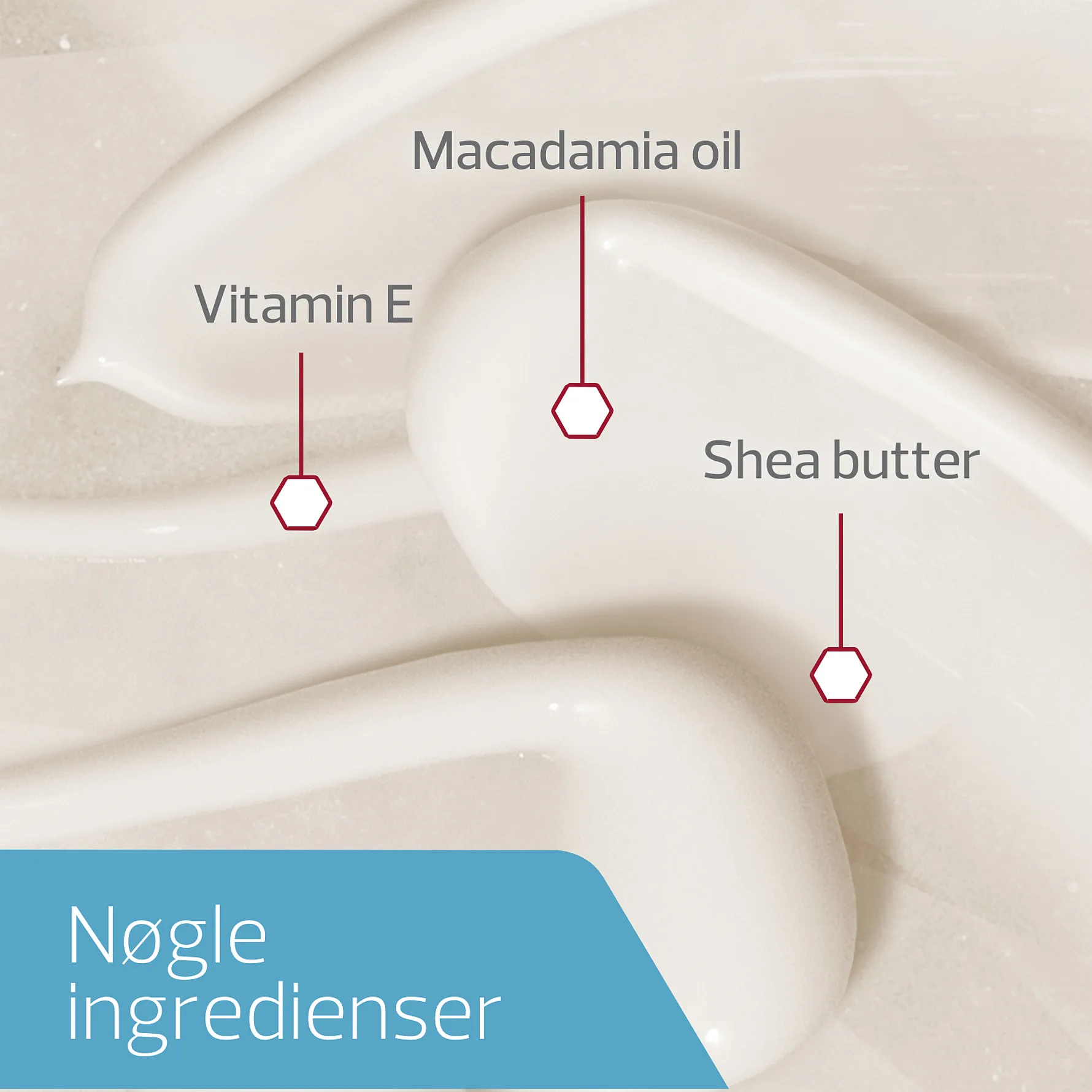 Indeholder 5 naturlige, nærende, fugtgivende og beroligende olier: Macadamiaolie, sød mandelolie, jojobaolie, kakaosmør og sheasmør.