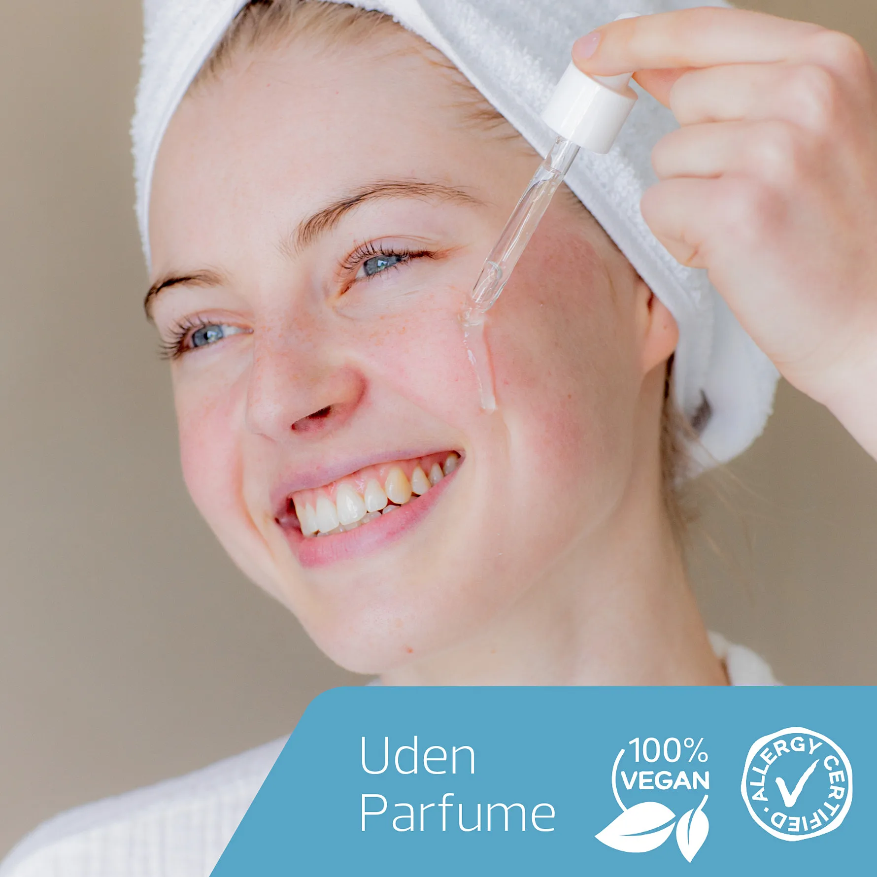 Påfør 4 dråber, massér forsigtigt ind i huden. Fortsæt med dag – eller natcreme, når serum er absorberet.