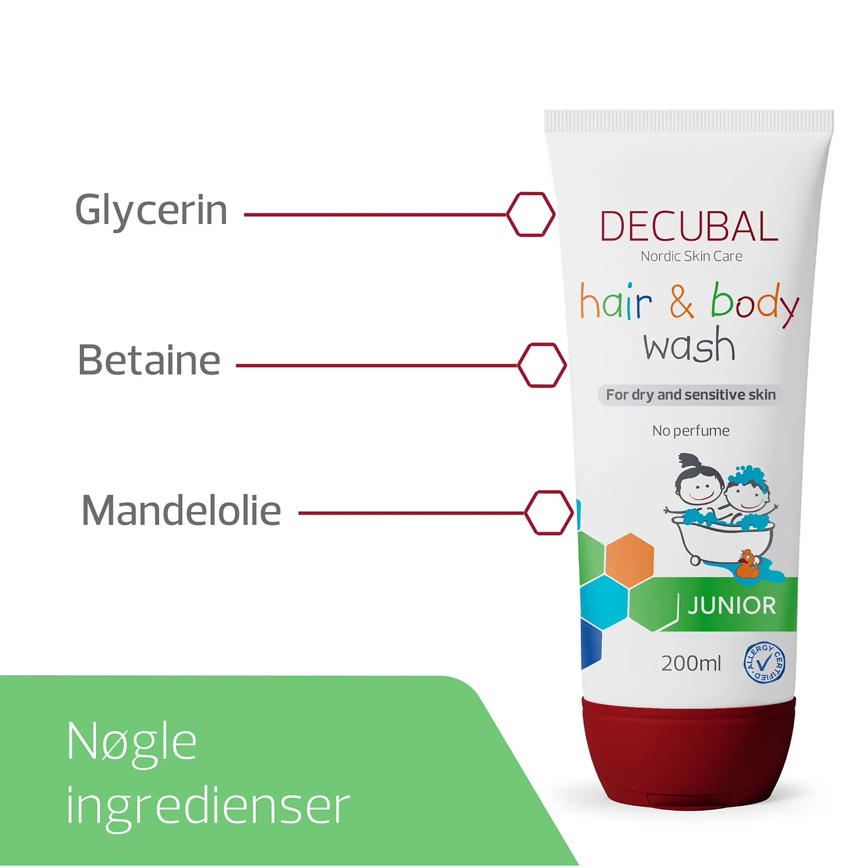 Decubal Junior Hair & Body Wash er et 2-i-1 vaskeprodukt til skånsom vask af hår og krop.