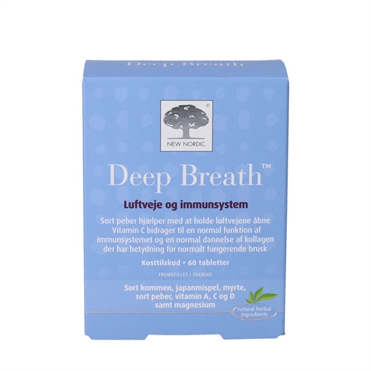 Deep Breath er et kosttilskud fra New Nordic, som er sammensat med udvalgte urtekstrakter, vitaminer og mineraler i tabletform. Serien tilbyder produkter designet til personer, der ønsker et supplement til kosten med relevante ingredienser. Hos Ugleapo finder du hele udvalgget med Deep Breath‑tabletter til online bestilling.