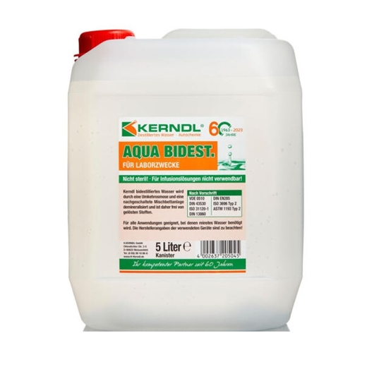 Det dobbeltdestillerede vand fra KERNDL er helt fri for opløste stoffer. Dette gør Aqua purificata ideel til anvendelser i laboratorier og i den kosmetiske industri. Levering i en robust premium-beholder som sikrer lækagefri transport.