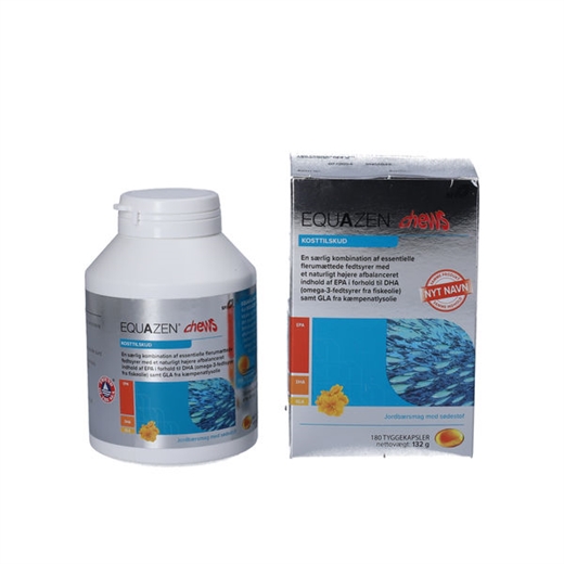 Equazen Chews Tyggekapsler er et kosttilskud, der indeholder en særlig kombination af essentielle flerumættede fedtsyrer med et naturligt højere indhold af EPA i forhold til DHA (omega-3 fedtsyrer fra fiskeolie (fra sardiner, makrel og ansjoser) i kombination med GLA (omega-6 fedtsyrer fra kæmpenatlysolie).