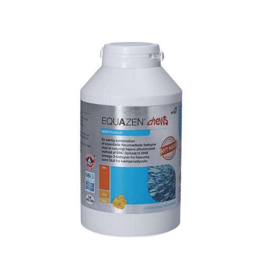 Equazen Chews Tyggekapsler er et kosttilskud, der indeholder en særlig kombination af essentielle flerumættede fedtsyrer med et naturligt højere indhold af EPA i forhold til DHA (omega-3 fedtsyrer fra fiskeolie (fra sardiner, makrel og ansjoser) i kombination med GLA (omega-6 fedtsyrer fra kæmpenatlysolie).