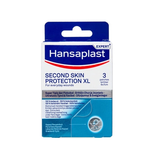 Hansaplast Second Skin Protection XL er et ultratyndt, vandtæt plaster, der beskytter som en anden hud. Det har ekstra stærk vedhæftning og bruger hydrokolloidteknologi til at fremme sårheling. Hydrokolloidteknologien skaber en helende kapsel over såret, som opretholder et optimalt fugtniveau i sårområdet. Det optimale fugtniveau i sårområdet fremskynder helingsprocessen og reducerer risikoen for ardannelse.