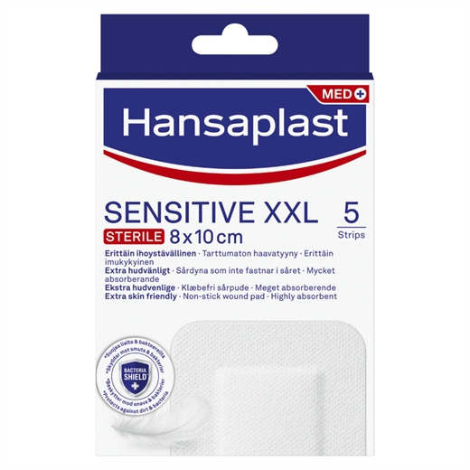 Hansaplast Sensitive XXL er sterile sårplastre, der er designet til at beskytte store sår og post-operative sår. Det ekstra hudvenlige og åndbare materiale klæber sikkert til huden, men kan stadig fjernes uden smerte. Den store sårpude føles blød mod såret uden at klistre fast, hvilket gør plasteret meget behageligt at anvende.