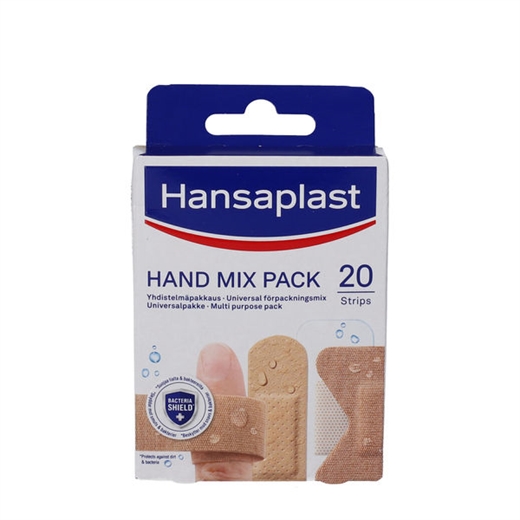 Hansplast Hand Mix Pack er en blandet universal pakke med fleksible, vandafvisende og vandtætte plastre til at dække og beskytte mindre sår.