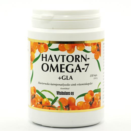 Havtorn-Omega-7 + GLA er et kosttilskud der indeholder havtornolie, kæmpenatlysolie samt zink og vitamin E og pantotensyre.