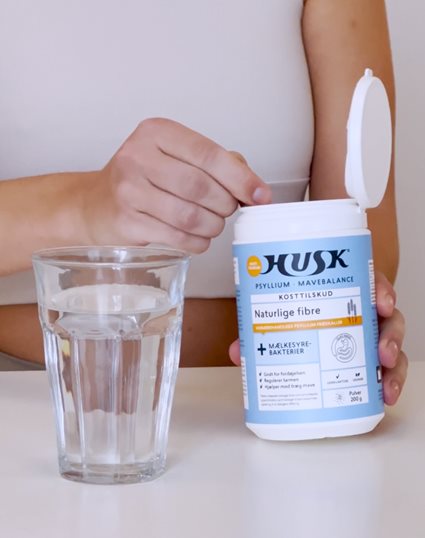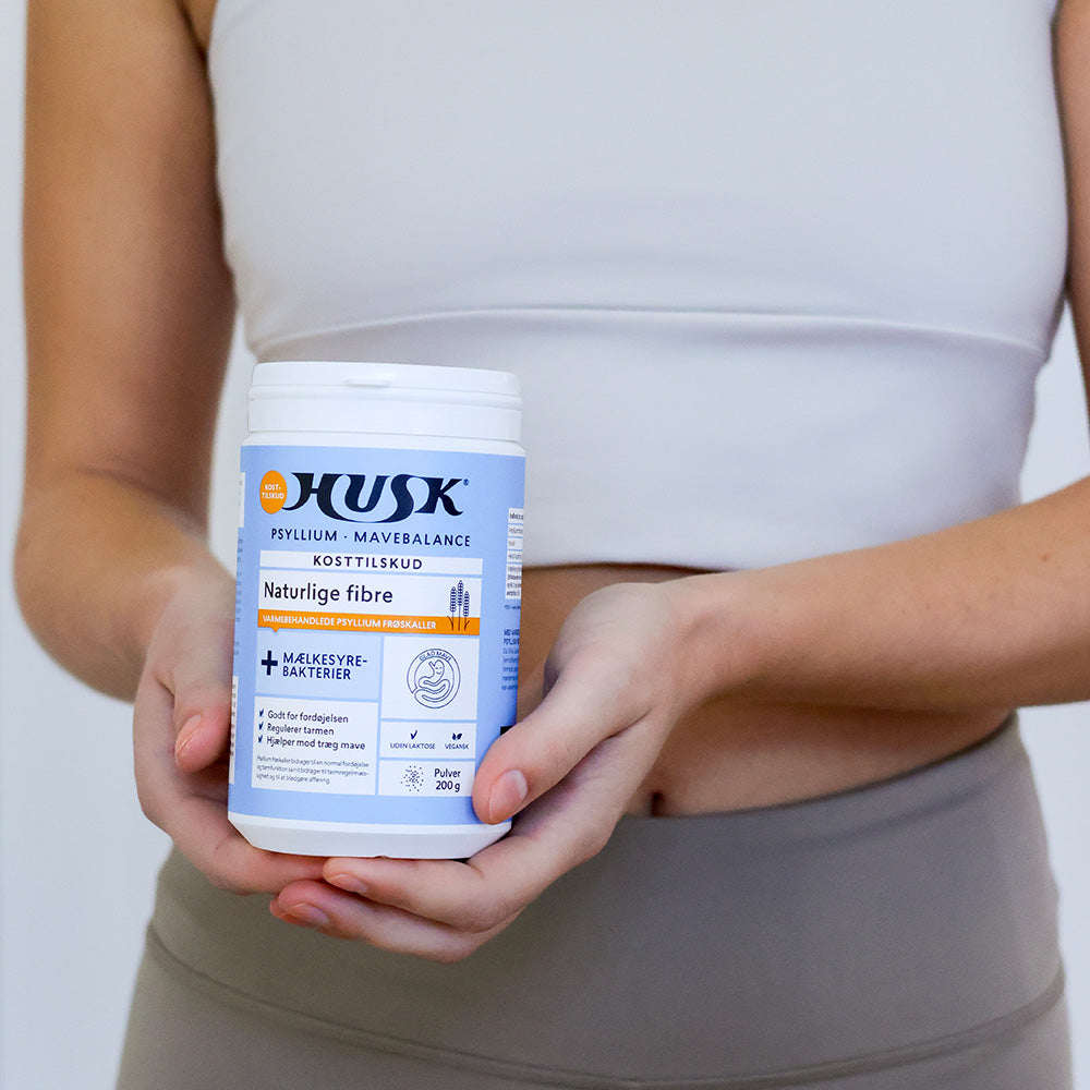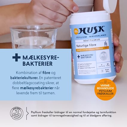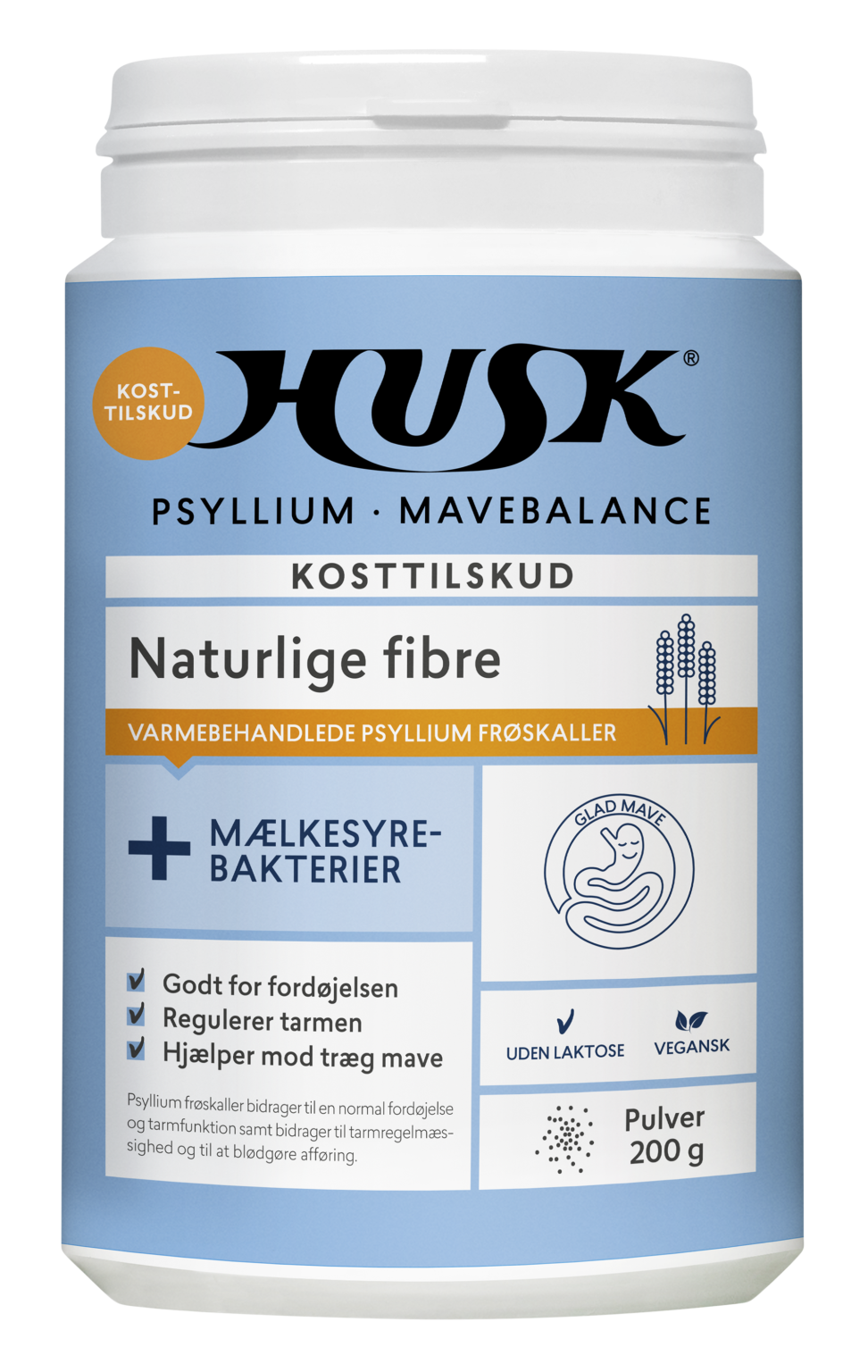 HUSK Psyllium Mavebalance + Mælkesyrebakterier er et kosttilskud med naturlige fibre fra varmebehandlede loppefrøskaller (Psyllium frøskaller) samt mælkesyrebakterier fra 2 bakteriestammer.