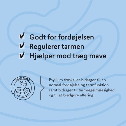 Psyllium frøskaller bidrager til en normal fordøjelse og tarmfunktion samt bidrager til tarmregelmæssighed og til at blødgøre afføring.