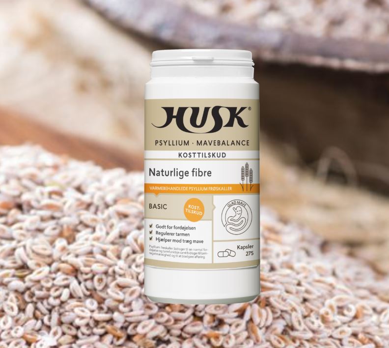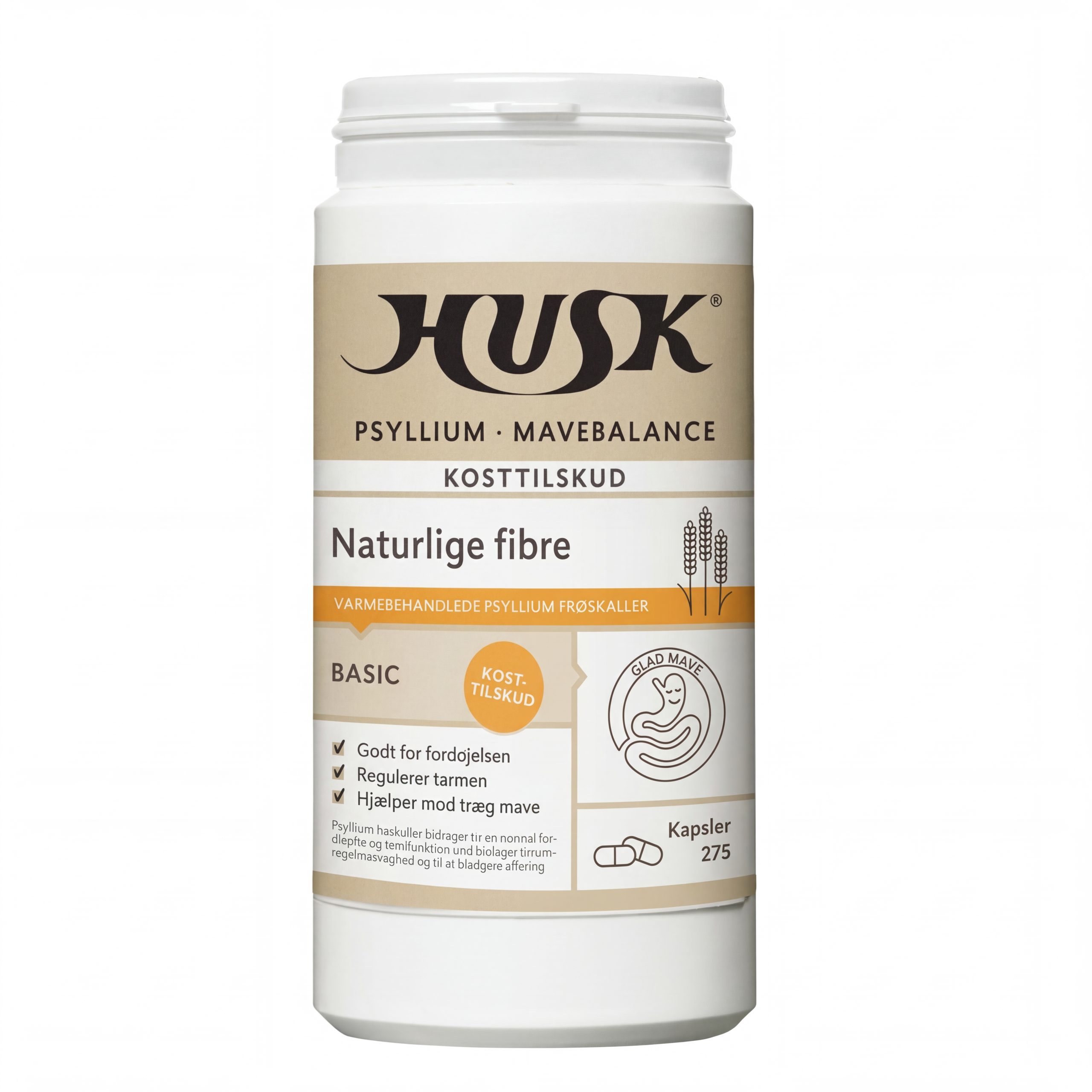 HUSK Psyllium Mavebalance Kapsler er et kosttilskud med naturlige fibre fra varmebehandlede loppefrøskaller (Psyllium frøskaller).