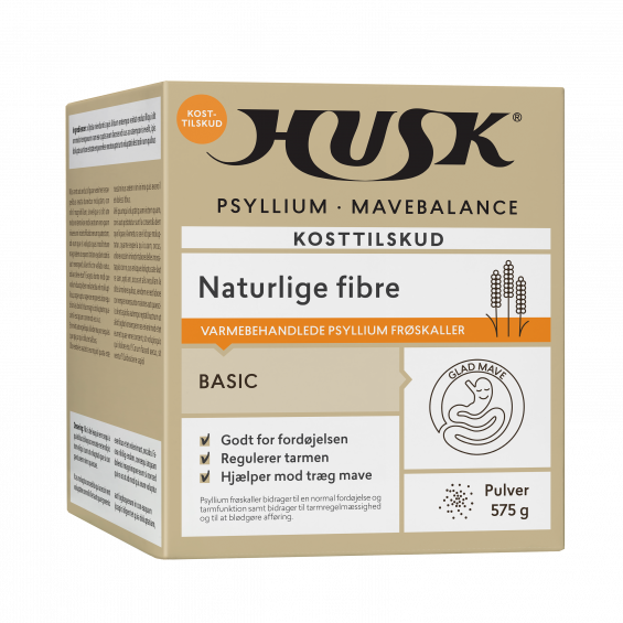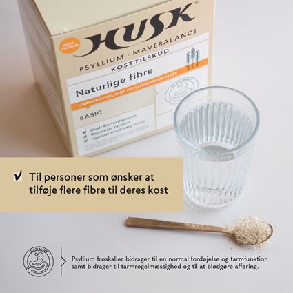 HUSK Psyllium Mavebalance er et kosttilskud med naturlige fibre fra varmebehandlede loppefrøskaller (Psyllium frøskaller).