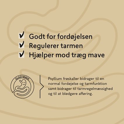 Psyllium frøskaller bidrager til en normal fordøjelse og tarmfunktion samt bidrager til tarmregelmæssighed og til at blødgøre afføring.