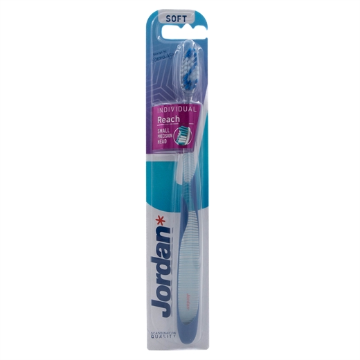 Denne Individual Clean soft tandbørste fra Jordan har en blød børstehårdhed. Tandbørsten har et tykt håndtag og et stort børstehoved.
