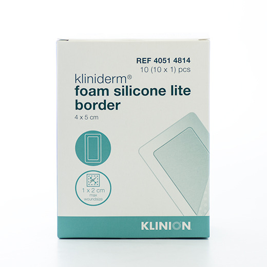 Kliniderm Foam Silicone Lite Border er sammensat af et silikonebelagt skumlag af væskeabsorberende polyurethan (til placering mod såret) samt en åndbar, vandtæt polyerethanfilm, som også virker som barriere mod bakterier og snavs.