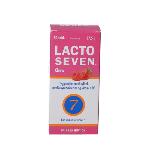 Lacto Seven Chew er et kosttilskud der indeholder syv forskellige naturlige mælkesyre-bakteriestammer, xylitol og vitamin D3.