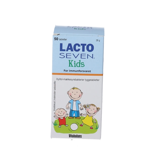 Lacto Seven Kids er et kosttilskud der indeholder syv forskellige naturlige mælkesyre-bakteriestammer og vitamin D.