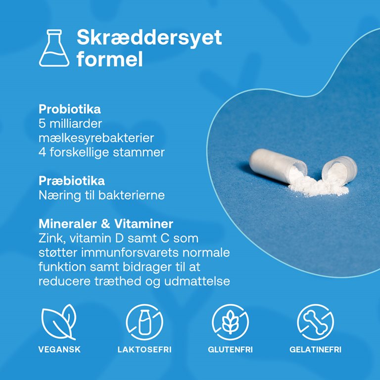 Majsfibre, Fruktooligosakkarider (FOS), Kapselmateriale (Hydroxypropylmethylcellulose), Antiklumpningsmidler (Talkum, Magnesium Salte Af Fedtsyrer, Siliciumdioxid), L. Rhamnosus DSMZ 32550, B. Lactis DSMZ 32269, S. Thermophilus DSMZ 32319, L. Casei NCIMB 30356, Vitamin C (L-Ascorbic Acid Coated), Zink Citrat, Vitamin D3 (Cladonia Rangiferina (L.)
