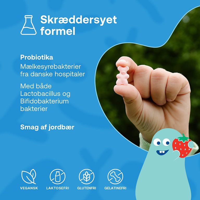 Ingredienser: Sødestoffer (sorbitol, mannitol), Lactobacillus reuteri CBS 145621, Lactobacillus rhamnosus DSMZ 26357, fyldemiddel (hydroxy propylcellulose), antiklumpningsmidler (magnesiumsalte af fedtsyrer, siliciumdioxid), aroma (ananas).