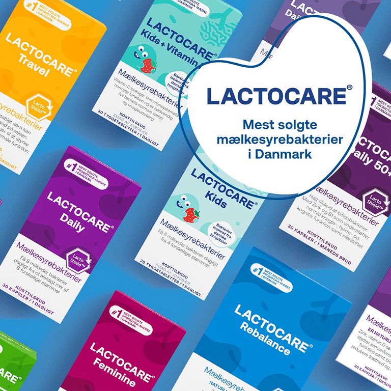 Lactocare Kids Tyggetabletter er et kosttilskud med levende mælkesyrebakterier, der kan tages af børn fra 3 år og opefter. Lactocare Kids indeholder 5 milliarder levende bakterier fordelt på 2 forskellige Lactobacillus stammer.