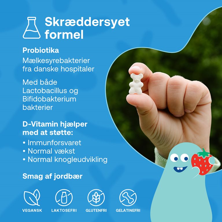 Sødestoffer (Sorbitol), Lactobacillus Reuteri CBS 145621, Lactobacillus Rhamnosus DSMZ 26357, Lactobacillus Plantarum CBS 138100, Bifidobacterium Lactis DSMZ 32269, Antiklumpningsmidler (Magnesiumsalte Af Fedtsyrer), Citron Syre, Aroma (Jordbær), Vitamin D3 (Cladonia Rangiferina (L.)
