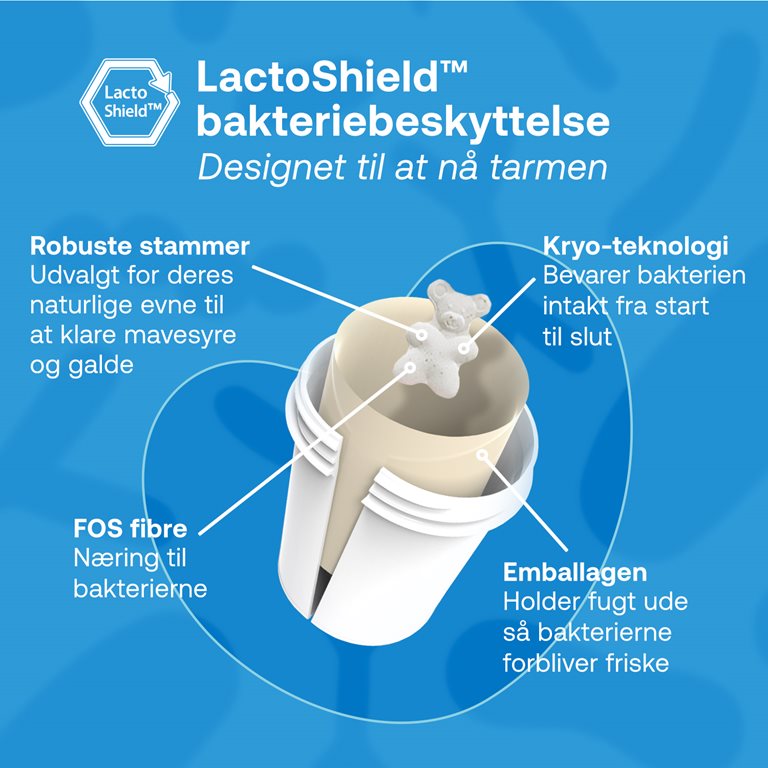 Produktet indeholder et dagligt tilskud af 5 milliarder mælkesyrebakterier sammensat af 2 forskellige mælkesyrebakteriestammer.
