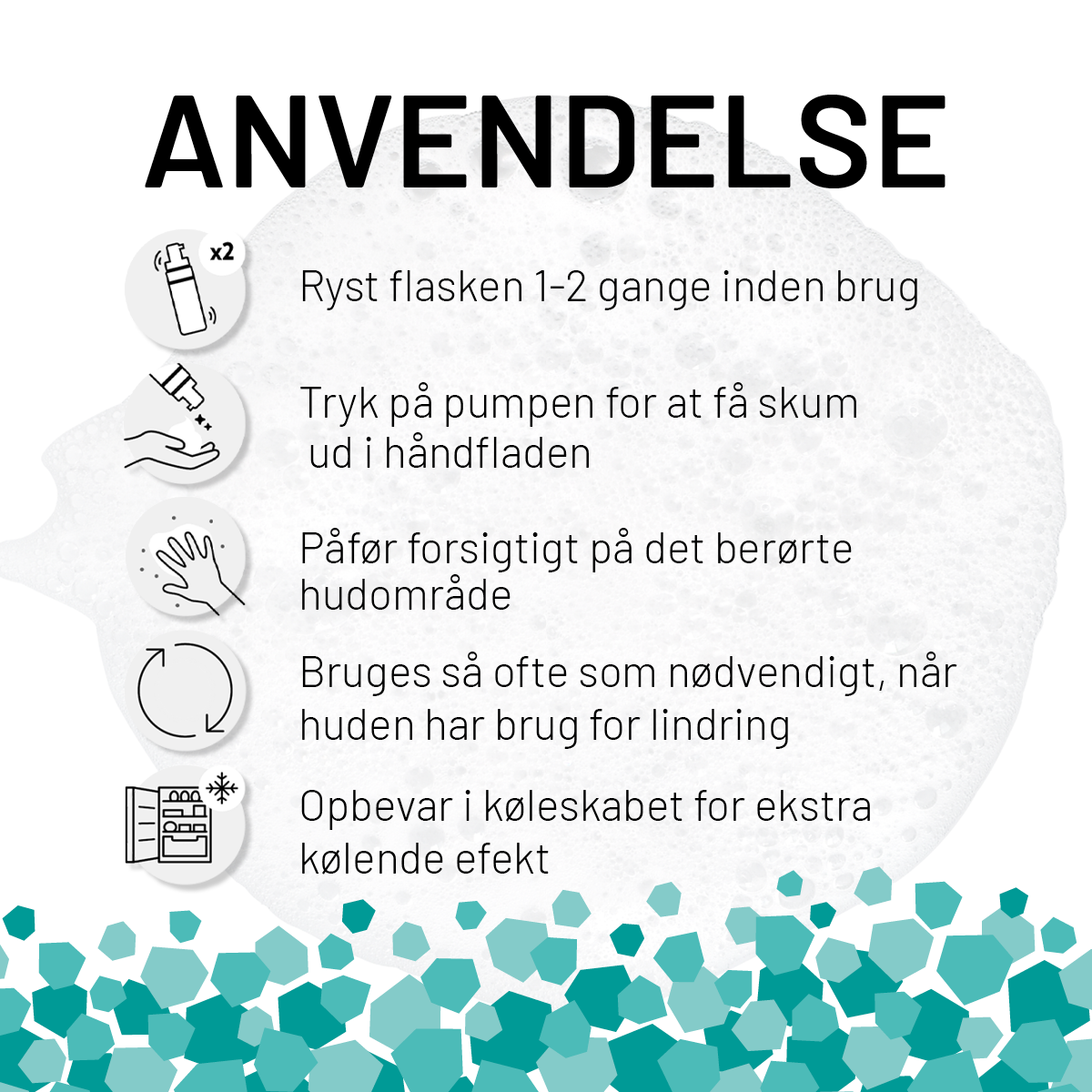 Tryk skum ud i håndfladen og påføres på det berørte hudområde.