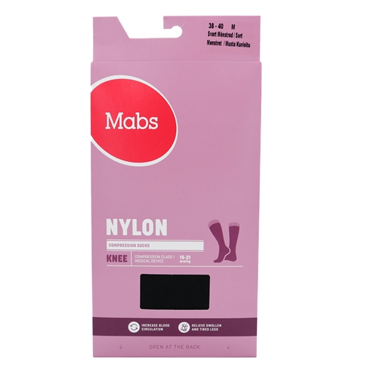 Mabs Nylon Knee Design er elegante mønstrede knæstrømper i 140 denier med kompression i nylon. Til hverdagsbrug. Øger blodgennemstrømningen og giver lindring til hævede og trætte ben. Modvirker risikoen for årebrok og blodprop og giver behagelig støtte.