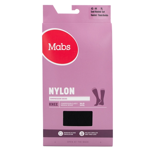 Mabs Nylon Knee Design er elegante mønstrede knæstrømper i 140 denier med kompression i nylon. Til hverdagsbrug. Øger blodgennemstrømningen og giver lindring til hævede og trætte ben. Modvirker risikoen for årebrok og blodprop og giver behagelig støtte.