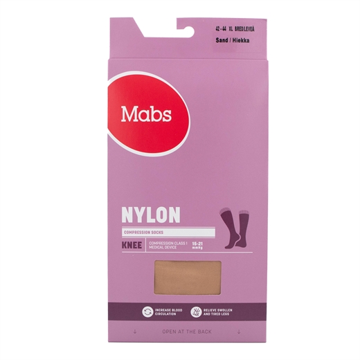 Mabs Nylon Cotton Knee Wide Sand er elegante nylonknæstrømper med kompression i 140 denier. Giver behagelig støtte og velegnet til brug hver dag. Øger blodgennemstrømningen og giver lindring til hævede og trætte ben. Modvirker risikoen for årebrok og blodprop.