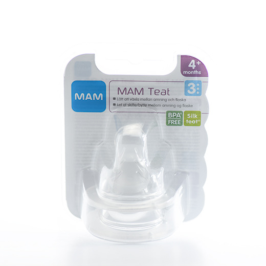 Flaskesutten har en symmetrisk facon, der er inspireret af brystet. Den er blød og føjelig og minder i formen om brystvorten. Det gør, at barnet kan anvende en lignende sutteteknik med MAM flaskesutten, som når barnet ligger ved moderens bryst. Derved mindskes også risikoen for at barnet bliver forvirret, når der veksles mellem brystet og sutteflasken.